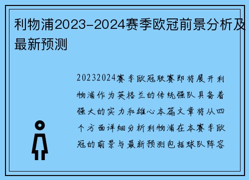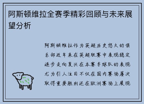在本篇文章中,我们将深入分析阿斯顿维拉英超剩余赛程的关键节点,并探讨该队能否顺利推进争四之路。阿斯顿维拉目前在英超联赛中处于相对有利的位置,但赛季接下来的挑战将对他们的争四目标产生决定性影响。通过对剩余赛程的各方面分析,包括球队的整体表现、对手分析、伤病情况以及赛程难度等因素,我们将全面评估阿斯顿维...