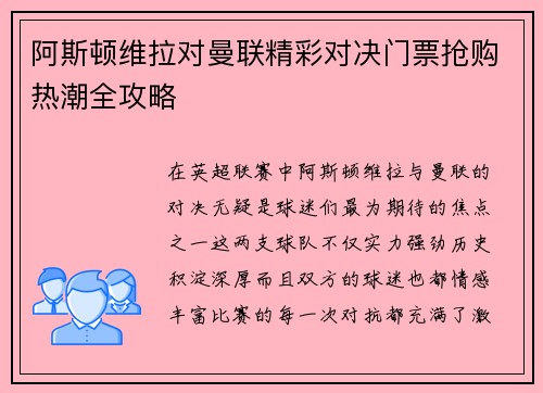 阿斯顿维拉足球俱乐部,作为英格兰足坛的历史劲旅之一,其主场维拉公园球场的看台和球迷文化向来备受关注。无论是激情四溢的现场氛围,还是深厚的历史传承,阿斯顿维拉看台无疑是足球文化中的一块重要瑰宝。本文将从四个方面详细阐述阿斯顿维拉看台的魅力与特色:一是球迷的激情与氛围,二是看台的历史积淀与传承,三是球迷...